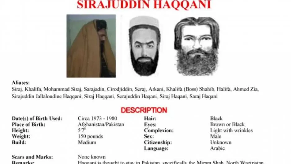 A wanted poster issued by the FBI for Sirajuddin Haqqani